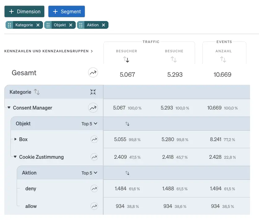 Innerhalb des neuen Berichts lassen sich die Daten über spezifische Dimensionen auswerten. Als Kategorie ist dauerhaft „Consent Manager“ definiert. Bei den Objekten wird bei Verwendung des etracker Consent Managers die Art des Dialogs – differenziert nach „Box“ und „Banner“ – angegeben. Ergänzend dazu findet sich das Objekt „Cookie Zustimmung“. Die entscheidenden Werte liefern die darunterliegenden Aktionen „allow“ und „deny“, welche die direkte Zustimmung oder Ablehnung der Nutzer widerspiegeln.