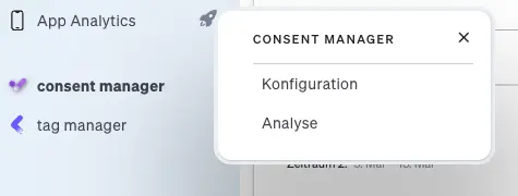 Für die Auswertung der Cookie-Zustimmung steht der Report "Analyse" zur Verfügung. Dieser ist über das Hauptmenü unter „Consent Manager“ erreichbar, welches hierfür um die neuen Untermenüs „Konfiguration“ und „Analyse“ erweitert wurde. Durch Klick auf "Analyse" gelangt man zu dem neuen Report.