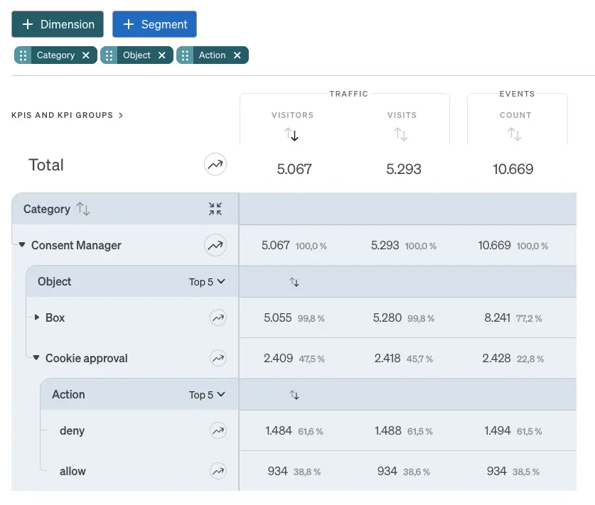 Important for analyzing the consent rate is the fact that only real events are recorded in the report. If a returning visitor calls up the page and is not shown the consent dialog again because their selection has already been saved, this call does not appear in the report. The statistics therefore focus purely on active interactions with the dialog.