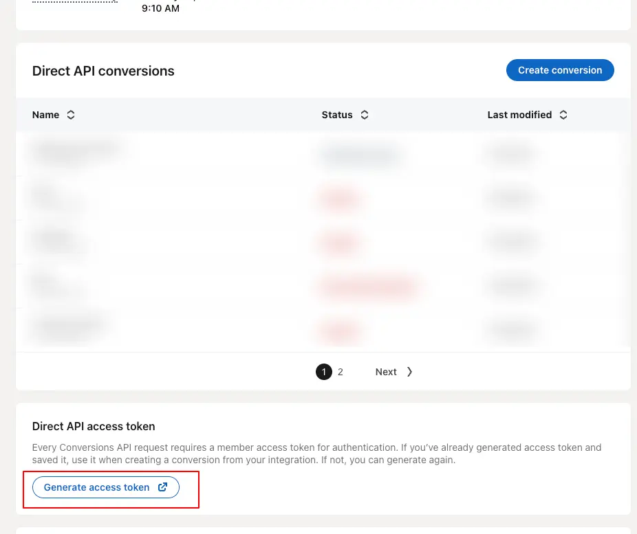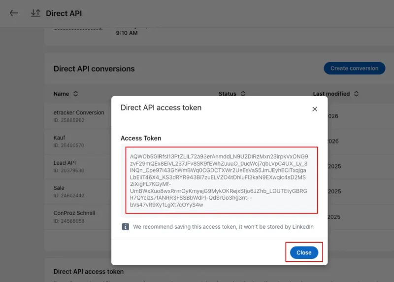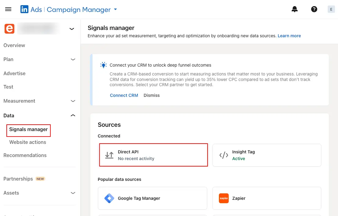 To create an access token, click on Data → Signal Manager:in → Direct API in the LinkedIn Campaign Manager menu bar.