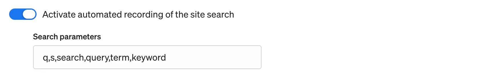 To set up tracking, go to Account → Automatic tracking → Internal Search. Activate the function using the switch in front of Activate automatic recording of internal searches and enter the appropriate search parameter – in the example above, sSearch (without quotation marks!). Then click on Save changes to apply the entries. Done!