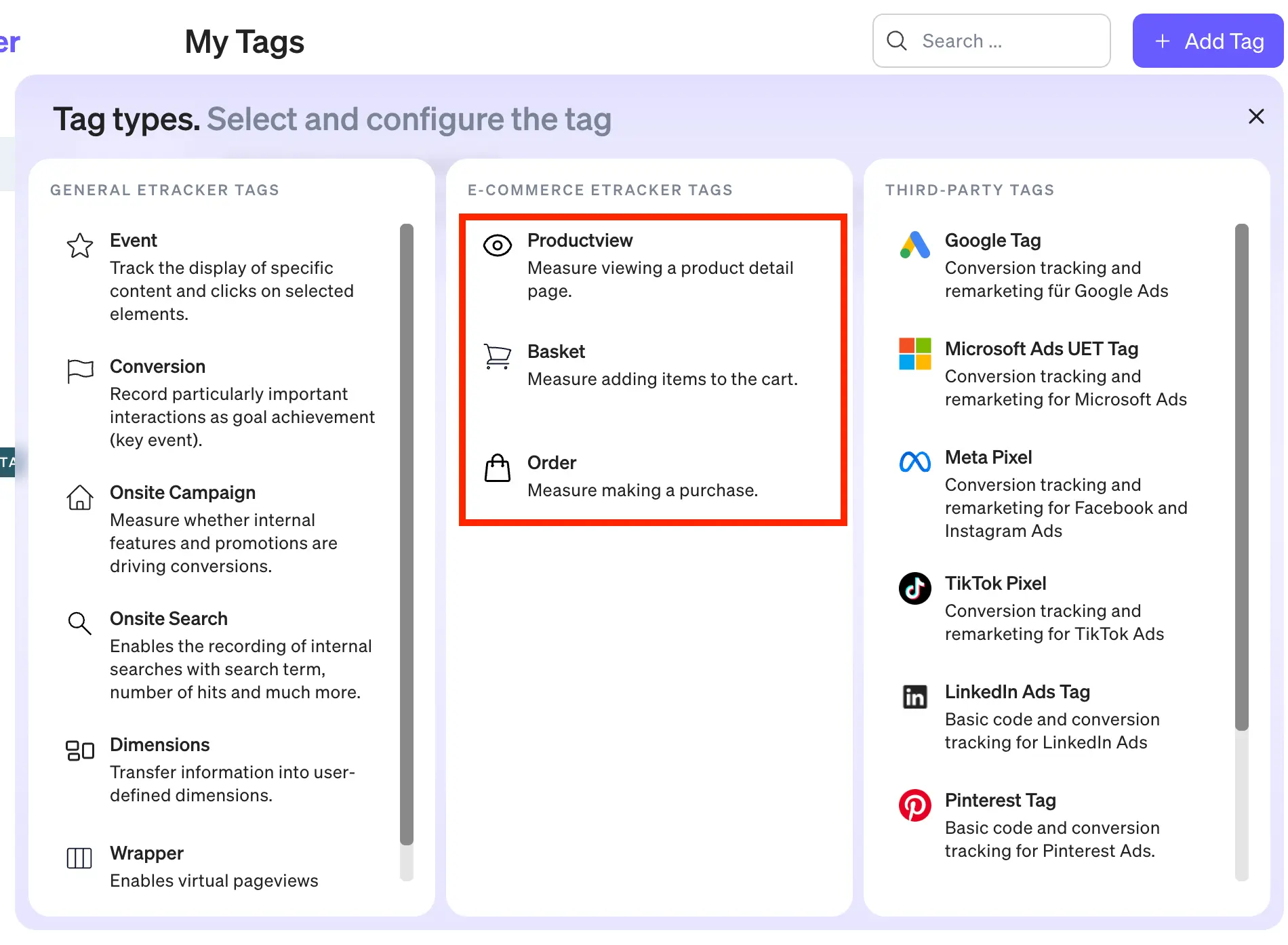 - Click on + Add tag and select the etracker event type from the etracker tags.