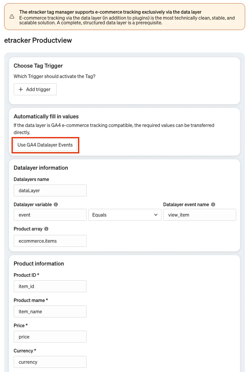 Before you start with the configuration in the etracker tag manager, check whether your store system fills the DataLayer variable with e-commerce information (ideally in the GA4 standard).
