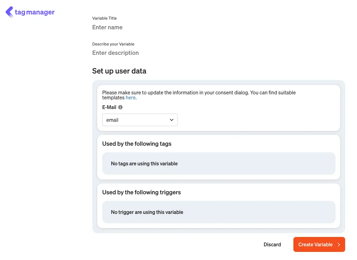 Select a previously created variable to read the email address from your store system or the DataLayer. We recommend using a DataLayer variable, as this is more “stable” than a DOM variable.