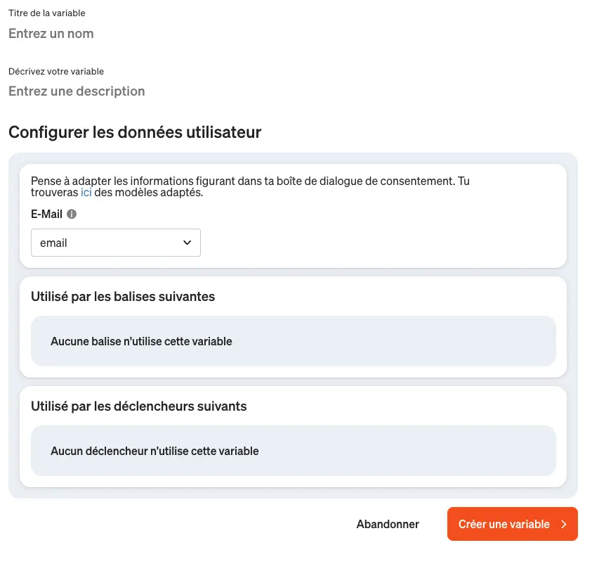 L’implémentation de conversions améliorées est particulièrement simple et confortable via etracker tag manager à l’aide d’une variable de type "données fournies par les utilisateurs".